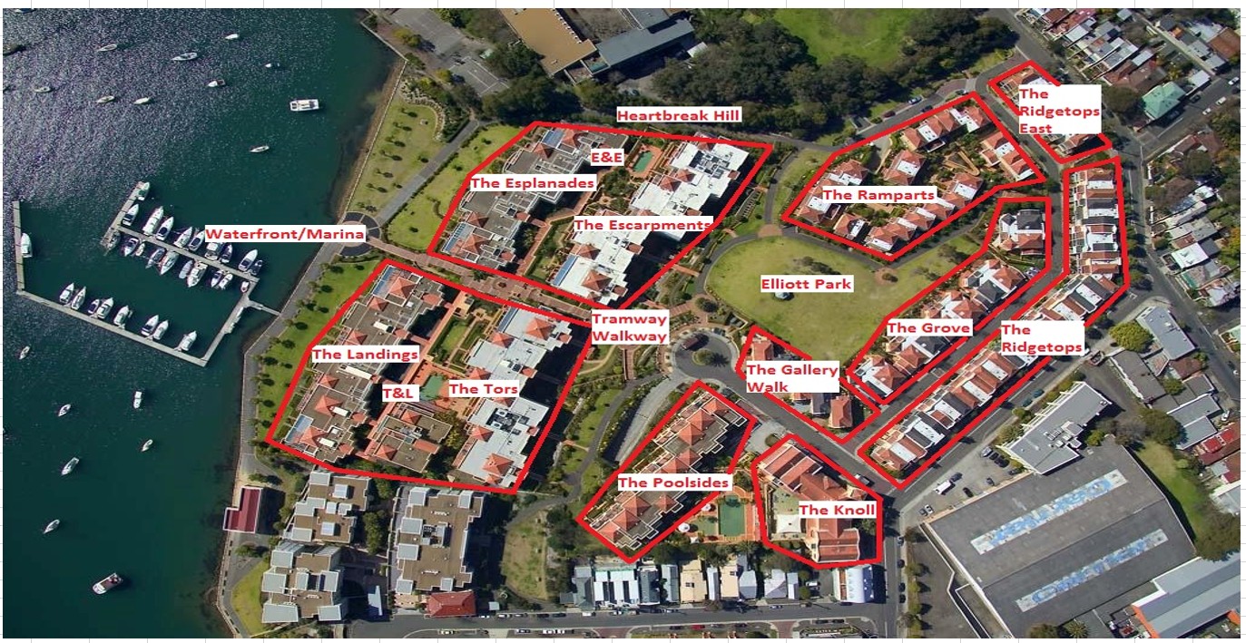 Building/Section names: a. The Knoll – 35 Terry Street (Unit 1-6, Shop 1-6) b. Poolsides – 1 Wulumay Close (Unit 1-28). c. T&L/Tors & Landing – 3 Wulumay Close (Unit 1-101). d. E&E/Escarpments & Esplanades – 5 Wulumay Close (Unit 102-189). e. Ramparts – 21 Waragal Avenue (Unit 1-20). f. Ridgetops – 8 to 52 Waragal Avenue. g. Ridgetops East – 54 to 64 Waragal Avenue. h. Gallery Walk – 2 to 10 Wulumay Close and 2, 4, 6 Waragal Avenue. i. Grove – 1 to 19 Waragal Avenue. The T&L, E&E & The Ramparts buildings have their respective building managers. The Knoll, The Poolside, The Ridgetops, The Ridgetops East, The Gallery Walk, & The Grove have no building manager. If required contact the CA committee member for the area. Strata Management – The Strata Management company for the Balmain Cove Community Association is Dynamic Property Services. Site Management- The Site Management company for the Balmain Cove Community Association is Strata Schemes Facility Management. Pathways or special section names: 1. Tramway walkway – between T&L and E&E stairs going down. 2. Waterfront & Marina – coming down from Tramway the walkway beside the water. 3. Balmain Cove Park- waterfront near school fence with Balmain Cove hedge sign. 4. Elliott Park – a park with a rotunda near E&E and Ramparts. 5. Heartbreak Hill – hilly walkway coming up from Waterfront to Ramparts beside E&E.